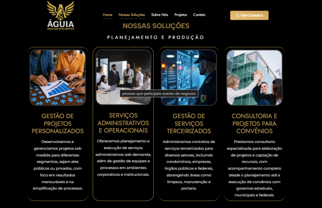 O foco não foi apenas listar serviços, mas criar uma plataforma que demonstrasse a capacidade e a seriedade da Águia.